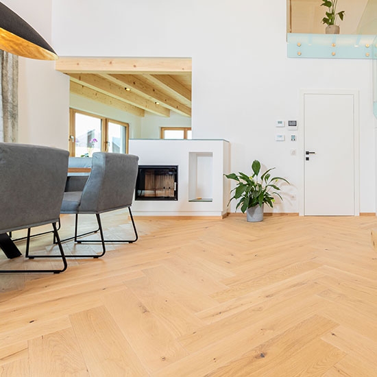 3-Schicht Parkett mit Fase auf allen Seiten und ca. 4 mm Decklamelle. Mittellage aus Fichte mit 9 mm Stärke. Gegenzug aus Fichte mit 2 mm Stärke. Nut/Feder auf allen Seiten. Der Fischgrät wird mit linken und rechten Stäben zu je gleicher Anzahl geliefert.