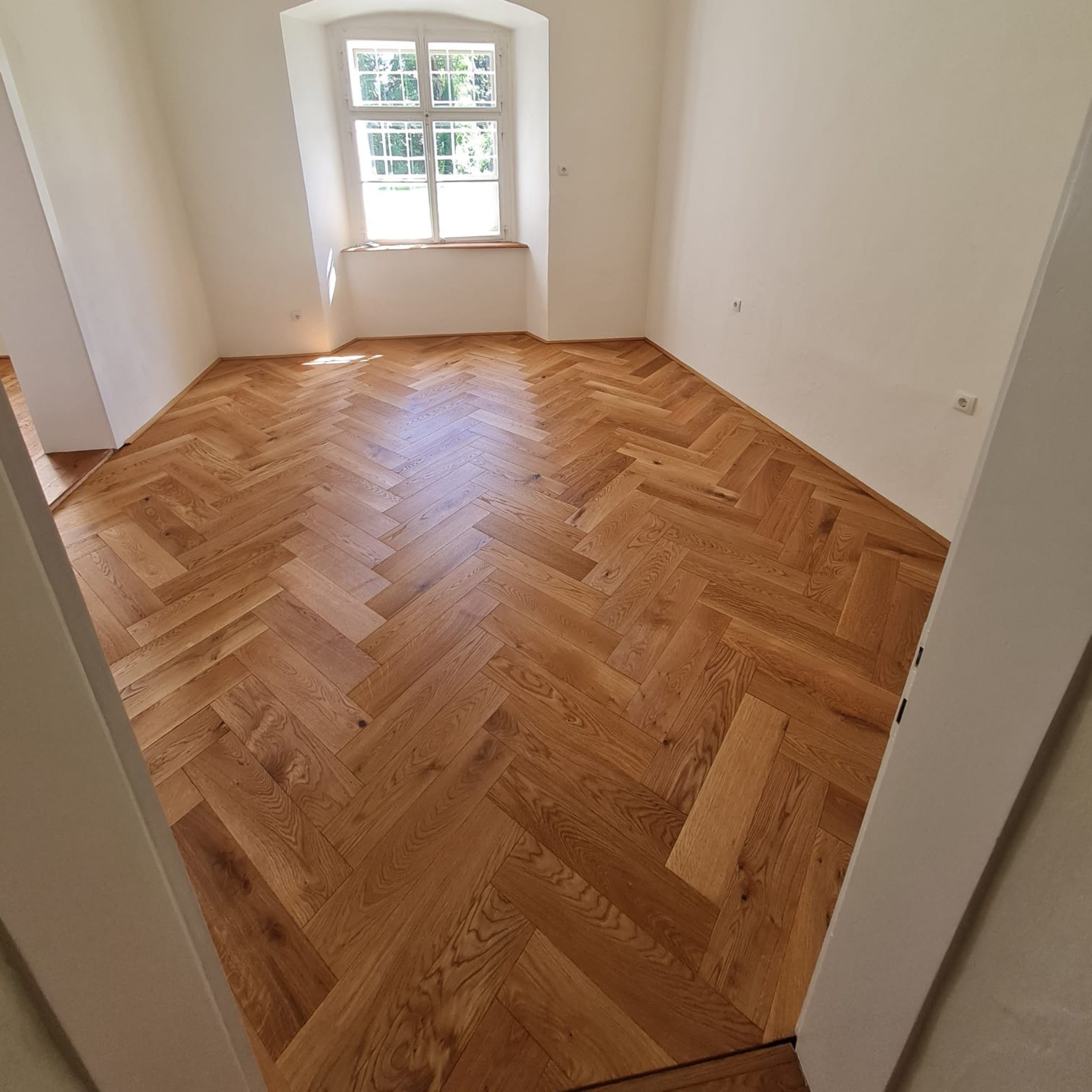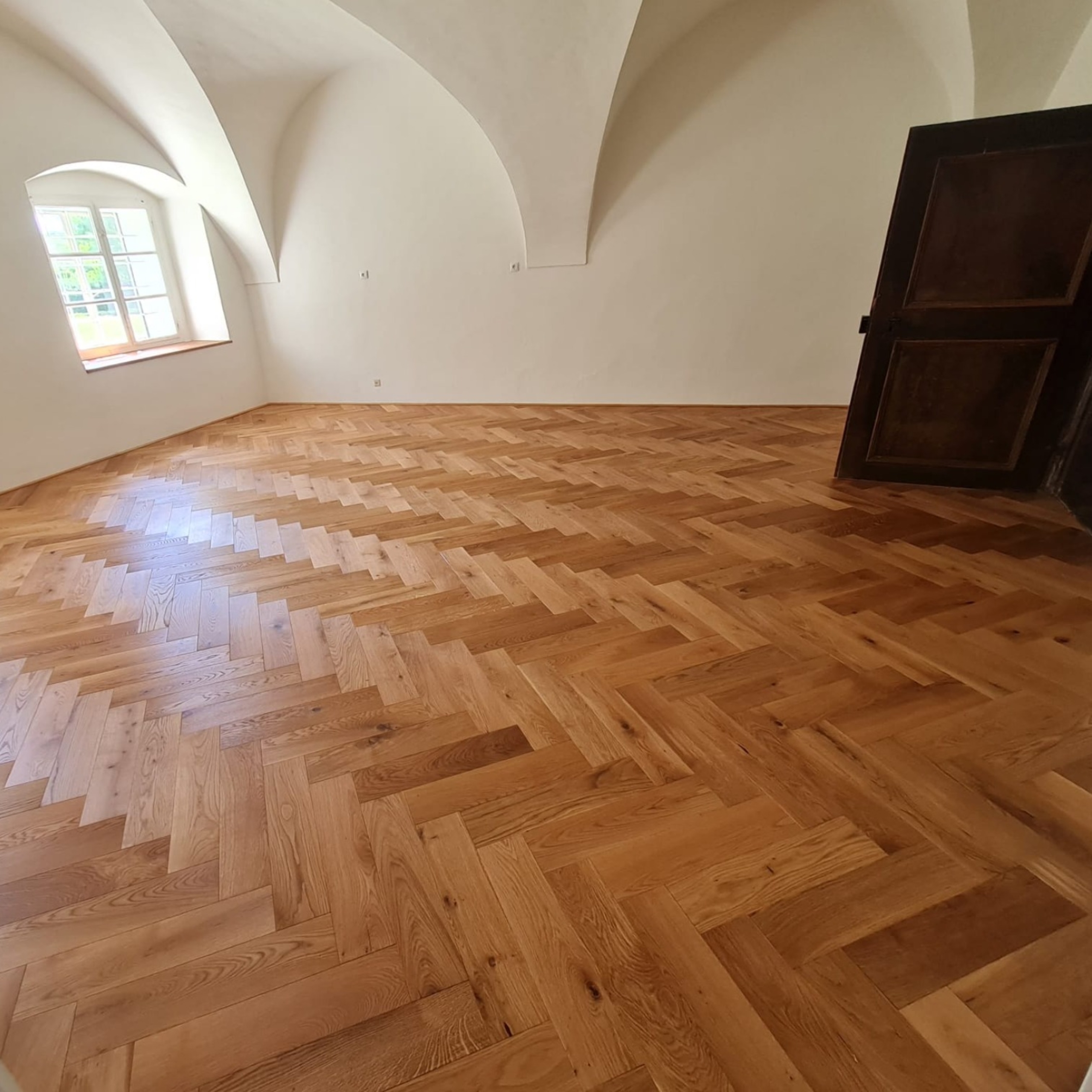 Massive Eichendielen mit Fase und Nut/Feder auf allen Seiten. Die fallenden Längen werden als Systemlänge mit 1800 mm Länge bei der Stärke 15 mm oder 2200 mm Länge bei der Stärke 20 mm geliefert. Massive Stäbe mit Fase und Nut/Feder auf allen Seiten oder stirnseitig mit Nut für fremde Feder. Der Fischgrät wird mit linken und rechten Stäben zu je gleicher Anzahl geliefert. Dielen und Stäbe mit FSC / PEFC Zertifikat auf Anfrage möglich.