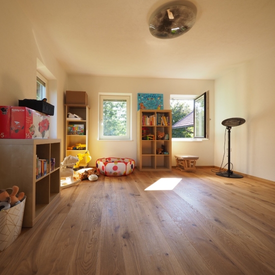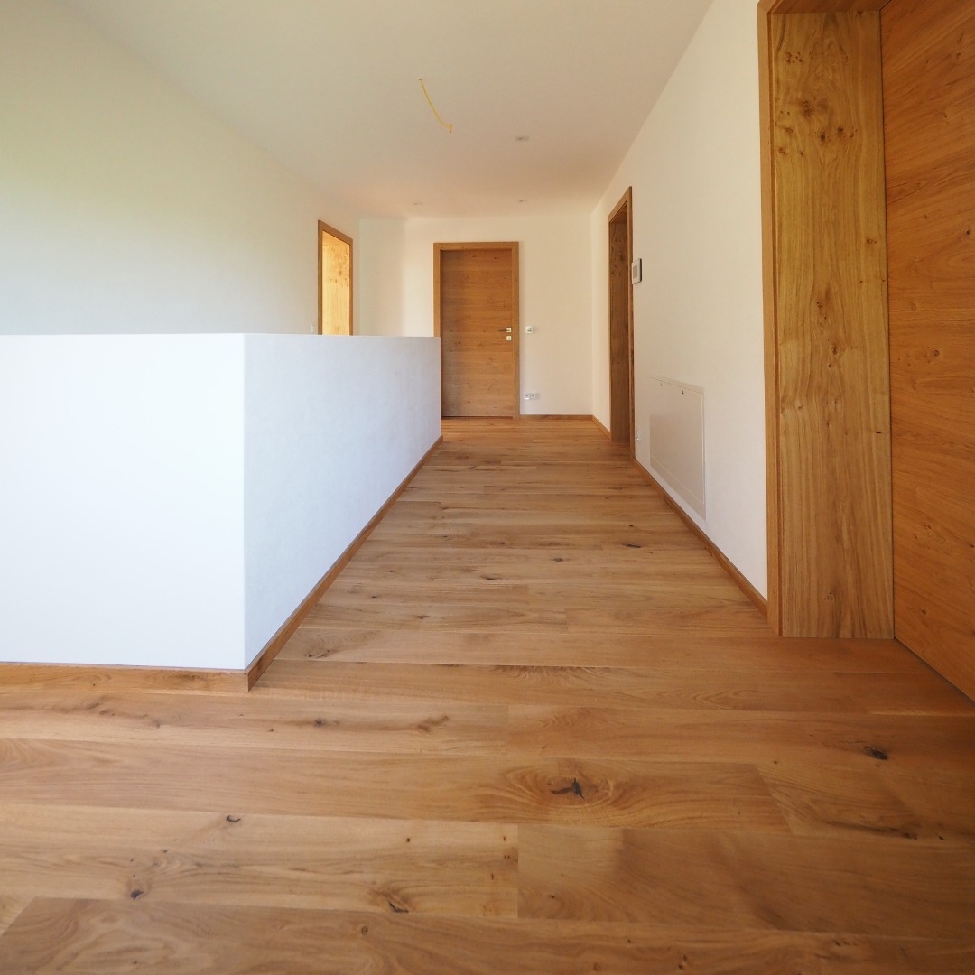 3-Schicht Parkett mit Fase auf den Längsseiten und ca. 3,2 mm Decklamelle. Mittellage aus Fichte mit ca. 7,5 mm Stärke. Gegenzug aus Fichte mit ca. 2 mm Stärke. Klick-Verbindung auf allen Seiten.